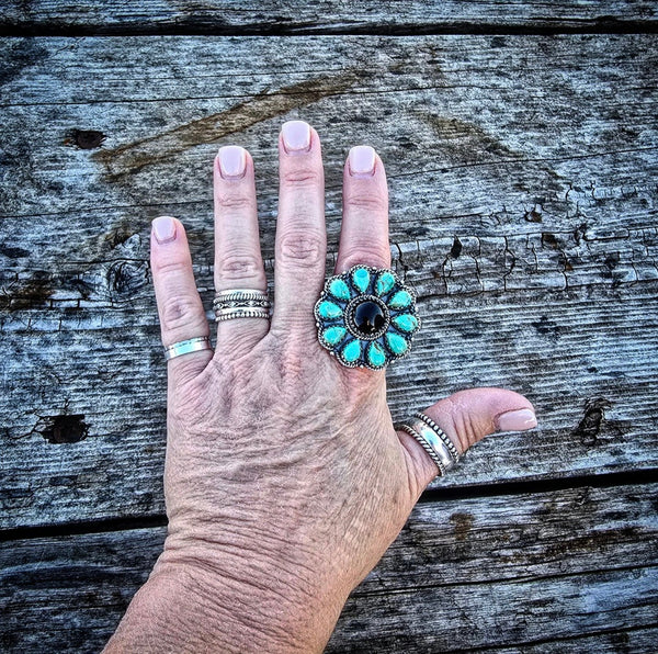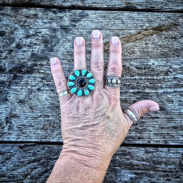 A jewelry fit that is - and lets be real . . this turquoise and gemstone ring is totally worth a scene! She is big, she is beautiful and she has all the details to make a statement in all the right ways! This turquoise and brown color combo does all the talking and is the perfect finishing touch for any occasion from a daily statement to a night on the town!