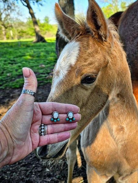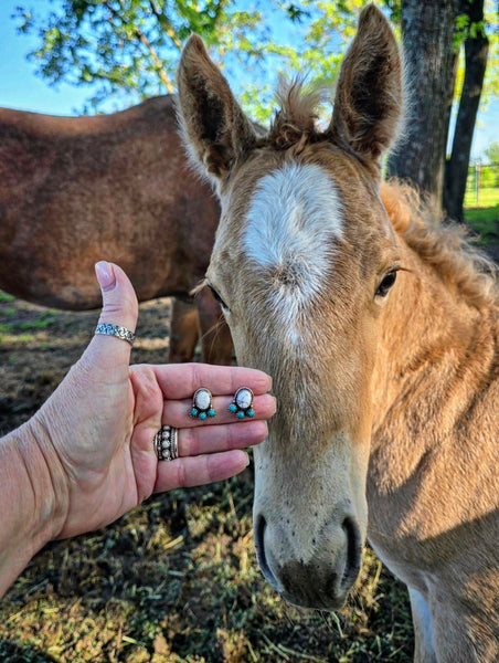 Girl, we ain't messin with the cuteness on these studs and are so - in - love! The white and turquoise stones together are absolutely dreamy! Classy, unique and the perfect pair of earrings to dress up a fit or go classy casual .. .. .. they do not disappoint!