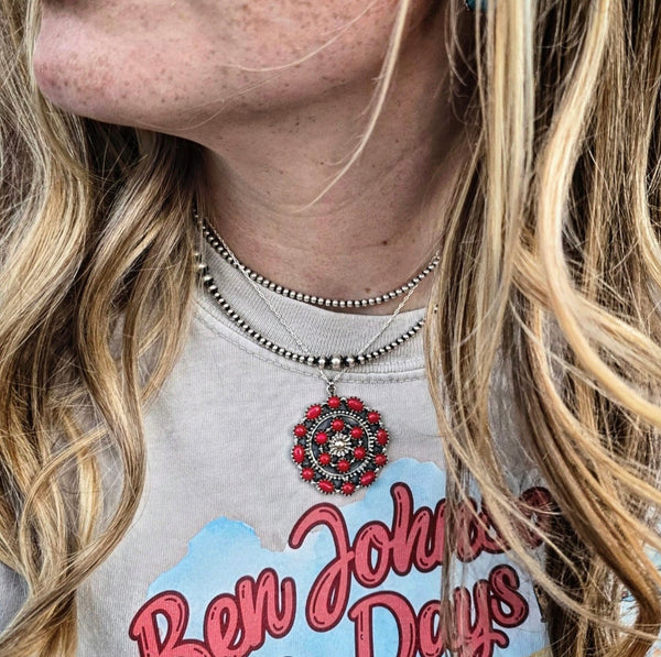 A jewelry fit that is - and lets be real . . this red corral concho pendant is totally worth a scene! She is big, she is beautiful and she has all the details to make a statement in all the right ways! The perfect pop of color to add in for any occasion from a daily statement to all the special occasions - we are totally thinking holidays . . . and did somebody say NFR!?